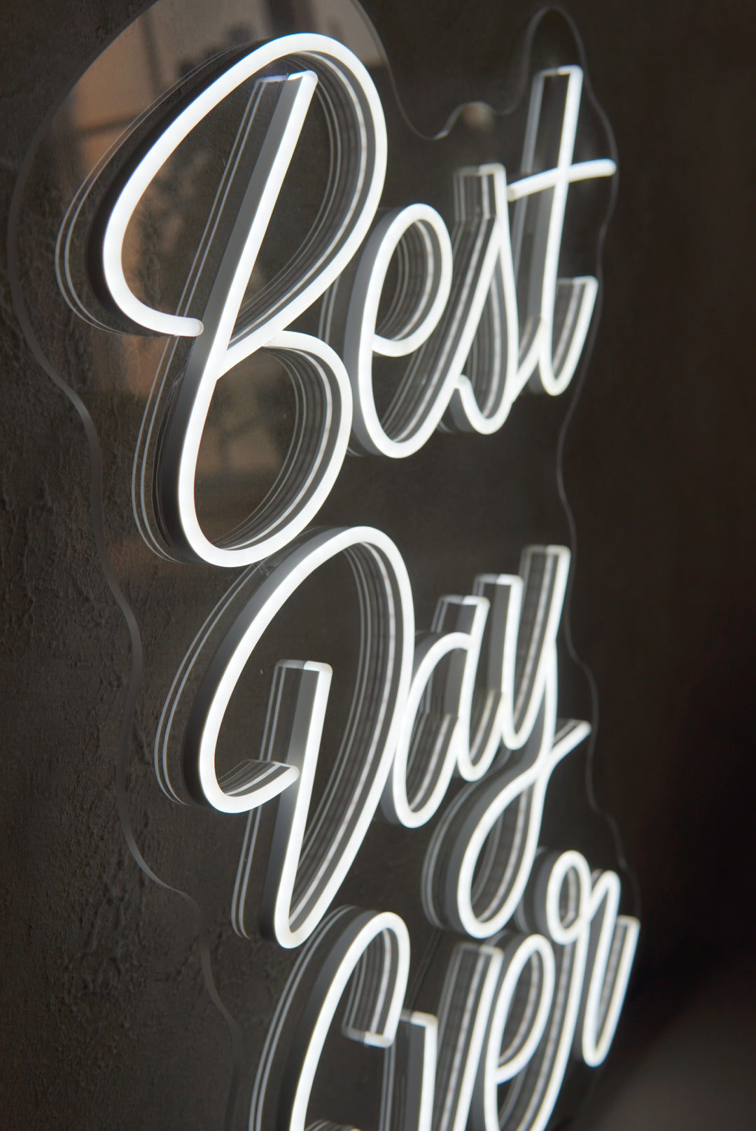 „Best Day Ever” – ideāla neona zīme, lai izgaismotu tavu īpašo dienu un piešķirtu tai vēl vairāk mirdzuma! Šis stilīgais un iedvesmojošais dekors ir perfekts kāzām, dzimšanas dienām vai jebkurām svinībām, padarot tās vēl neaizmirstamākas. Tā piešķirs telpai svētku noskaņu un radīs burvīgu atmosfēru katram īpašajam mirklim!