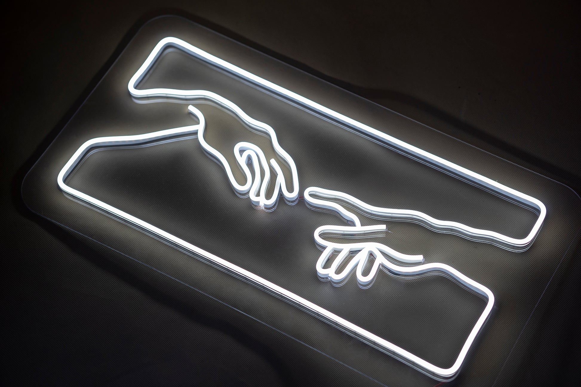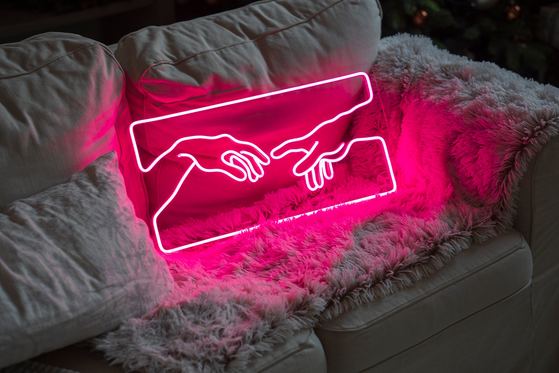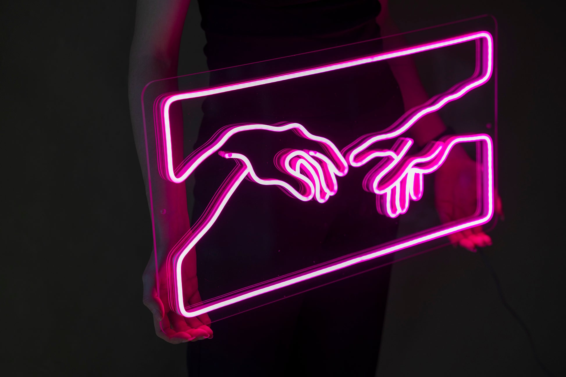 A modern tribute to the iconic artwork from the Sistine Chapel, the "Michelangelo's Hands" LED neon sign symbolizes creation, connection, and inspiration. Perfect for art studios, galleries, stylish interiors, or as a statement piece in your home, this glowing sign adds a touch of Renaissance elegance with a contemporary twist. Elevate your space with the "Michelangelo's Hands" neon sign, blending classic artistry with modern design.