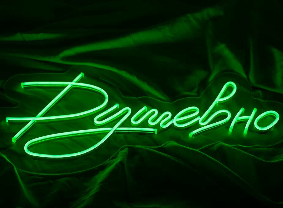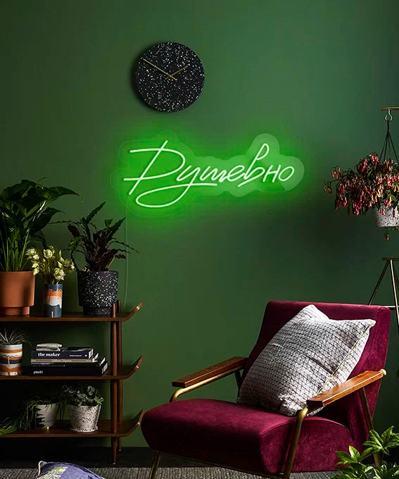 Неоновая вывеска "Душевно" — тёплый и уютный элемент декора, который создаст атмосферу гармонии и уюта в вашем пространстве. Слово "Душевно" идеально отражает атмосферу комфортного и спокойного места, где можно отдохнуть и насладиться моментом.