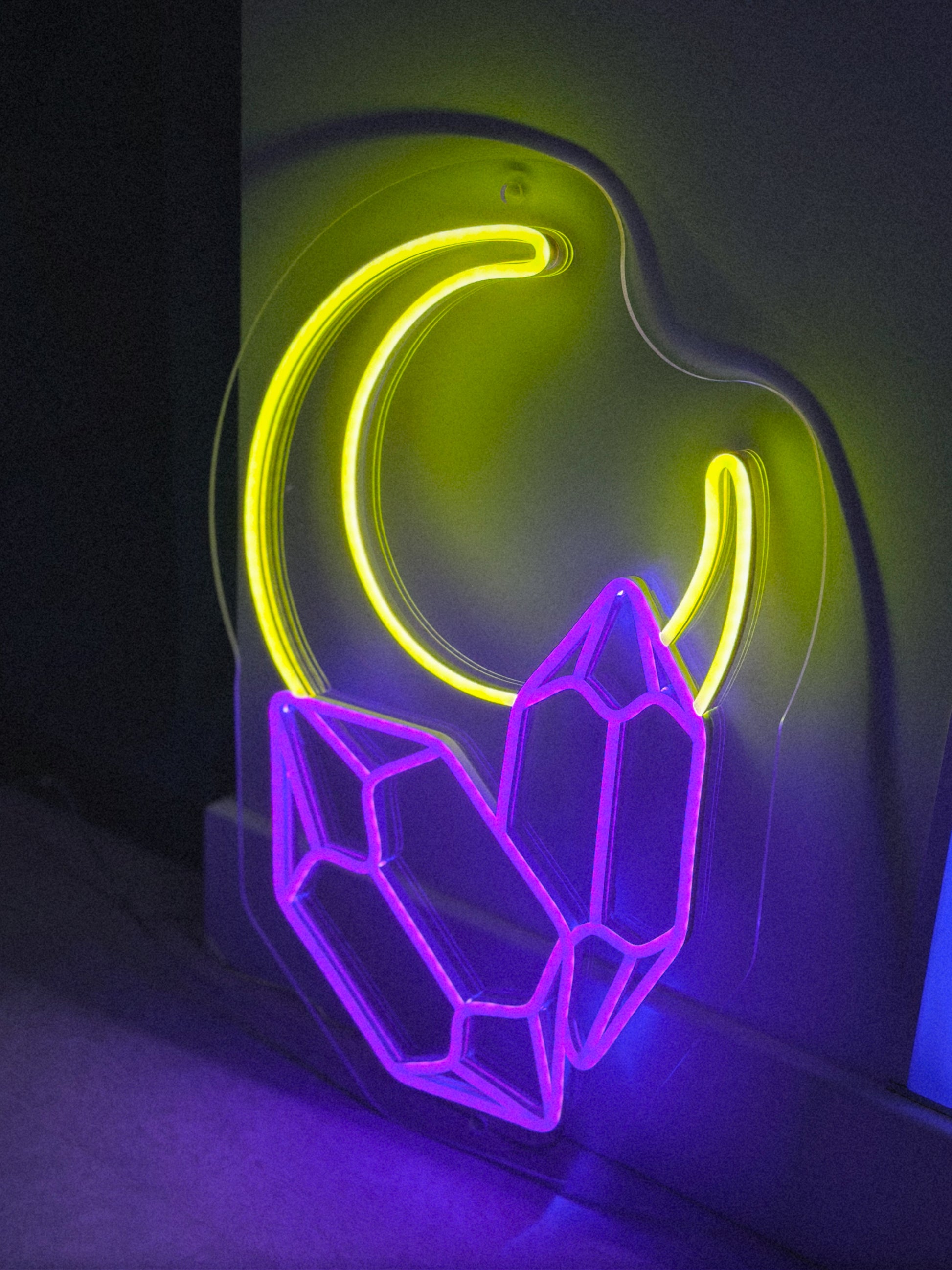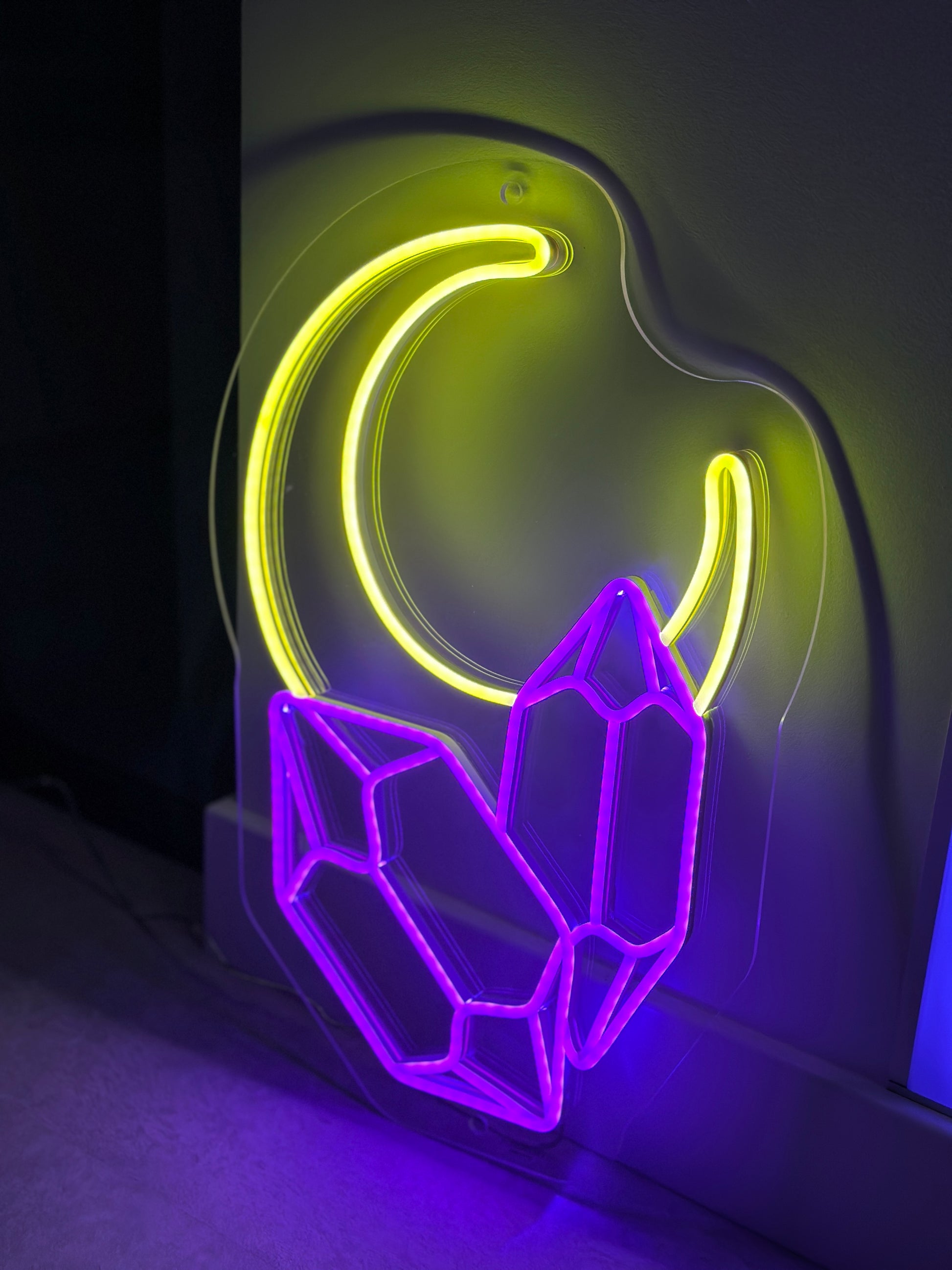 Неоновая вывеска "Moon And Crystals" — загадочный и магический элемент декора, который добавит в ваше пространство атмосферу мистики и вдохновения.