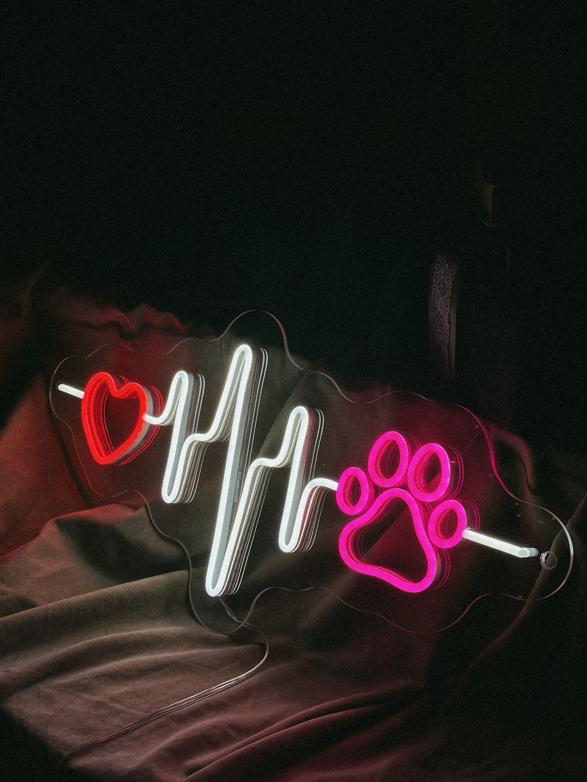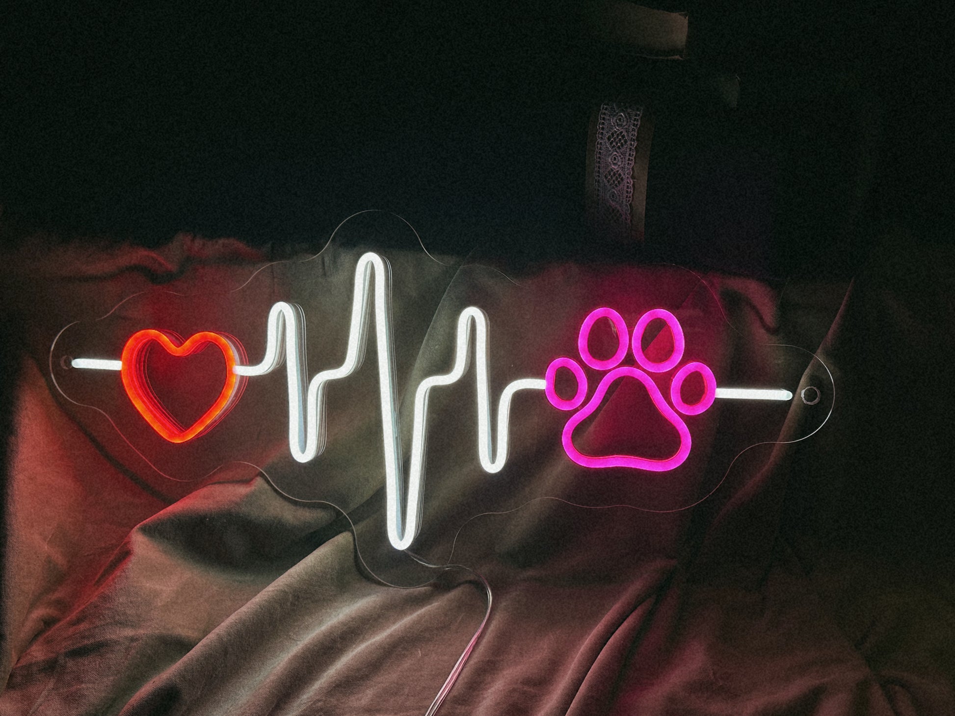 Неоновая вывеска "Pet Heartbeat" — трогательный и стильный элемент декора, который будет идеальным выбором для любителей животных и тех, кто ценит свою связь с питомцами.