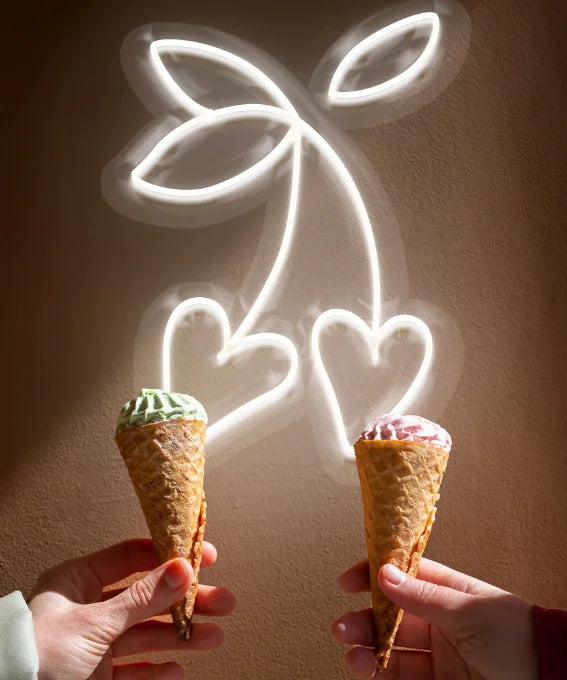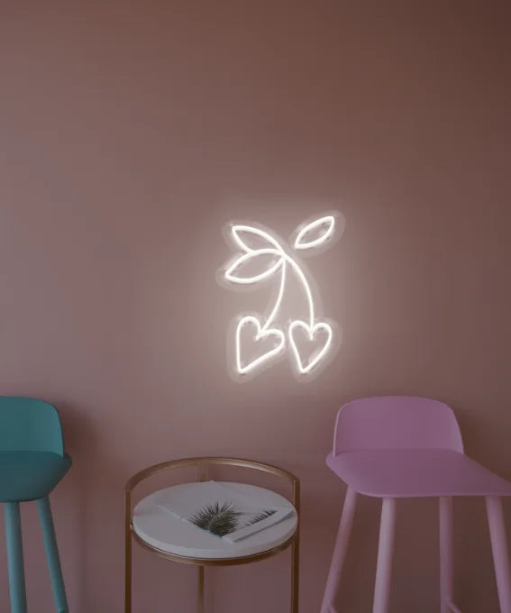 Неоновая вывеска "Heart Shaped Cherries" — стильный и игривый элемент декора, который привнесет в ваше пространство атмосферу свежести, любви и веселья.