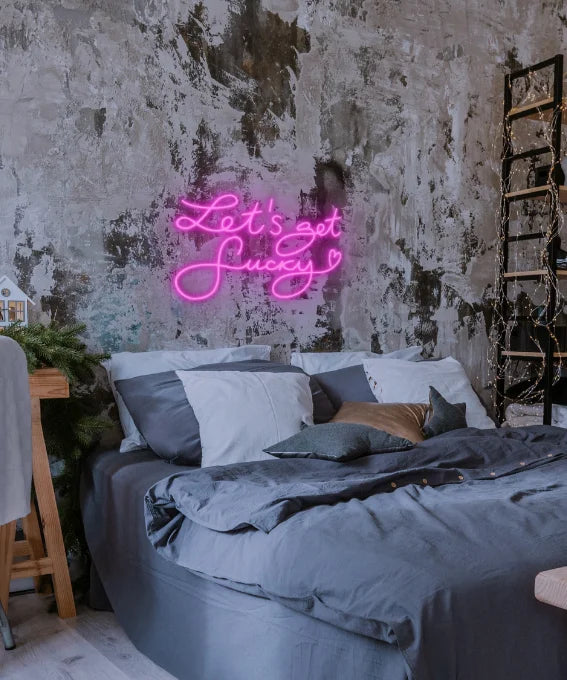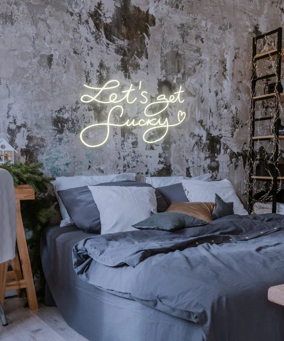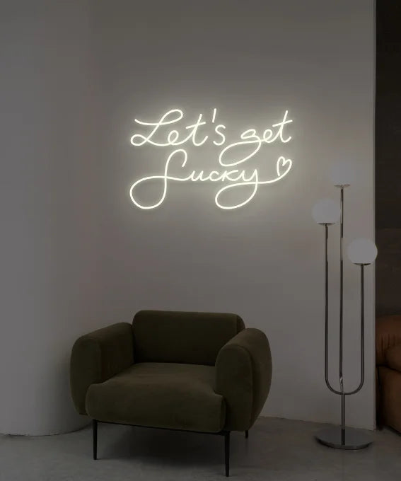 Неоновая вывеска "Let’s Get Lucky" — энергичный и яркий элемент декора, который создаст в вашем пространстве атмосферу веселья и удачи.